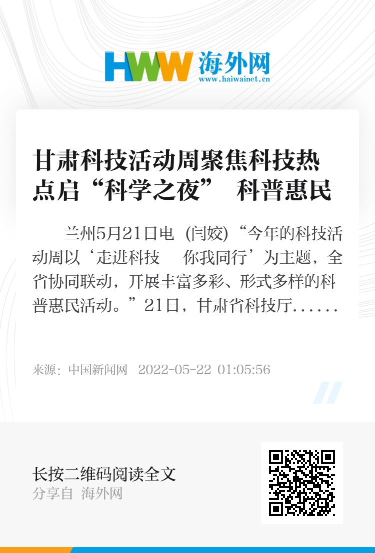 当日,“2022年甘肃省科技活动周主场启动仪式”在嘉峪关举行,与此同时,该省14个市州和兰州新区也同步启动科技活动周。科技周活动多样:甘肃省第十六届中小学生科学知识网络竞答活动评选出300名优秀学生个人,2022年甘肃省第七届科普讲解大赛决赛完美收官,全省十佳科普使者新鲜出炉……