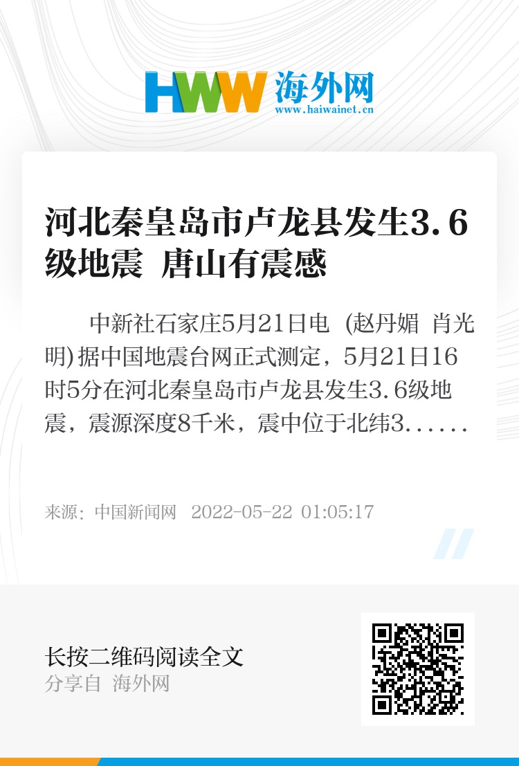 中新社石家庄5月21日电 (赵丹媚 肖光明)据中国地震台网正式测定,5月21日16时5分在河北秦皇岛市卢龙县发生3.6级地震,震源深度8千米,震中位于北纬39.95度,东经118.98度。秦皇岛市、唐山市、承德市部分地区居民有震感。
