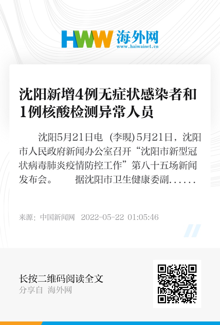据沈阳市卫生健康委副主任、新闻发言人贺燕通报:2022年5月20日0时至5月21日12时,沈阳市无新增本土新冠肺炎确诊病例;新增4例本土新冠病毒无症状感染者和1例核酸检测异常人员,系对重点人群例行核酸筛查和密切接触者隔离医学观察期间核酸检测中发现。市卫生健康委接到报告后,立即调派120负压急救车第一时间将上述人员转运至定点医院诊断治疗。