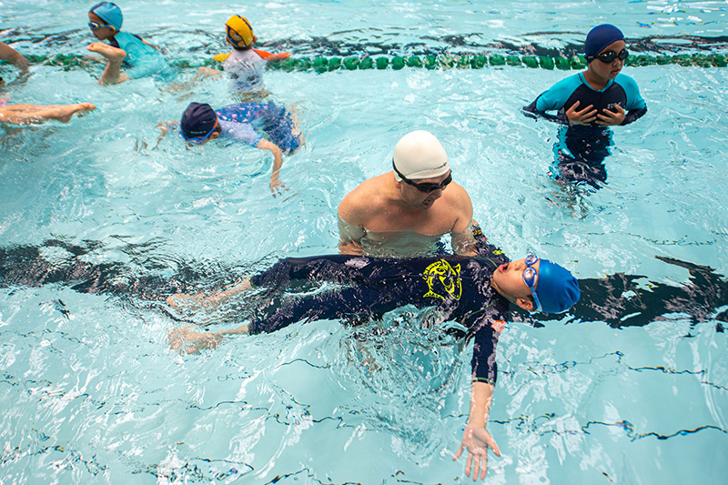5月21日,小朋友在志愿者的帮助下练习落水时的自救姿势。