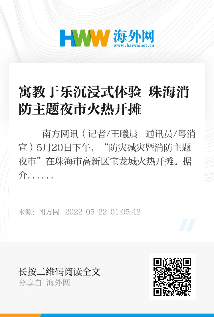 南方网讯(记者/王曦晨 通讯员/粤消宣)5月20日下午,“防灾减灾暨消防主题夜市”在珠海市高新区宝龙城火热开摊。据介绍,该活动由广东省消防救援总队主办,珠海市消防救援支队、高新区消防救援大队协办。