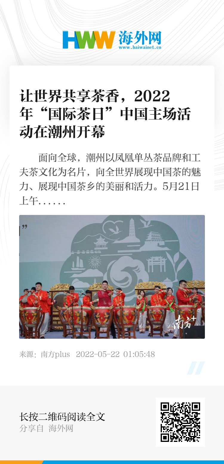 面向全球,潮州以凤凰单丛茶品牌和工夫茶文化为名片,向全世界展现中国茶的魅力、展现中国茶乡的美丽和活力。5月21日上午,2022年“国际茶日”中国主场活动在中国茶乡——潮州市开幕。