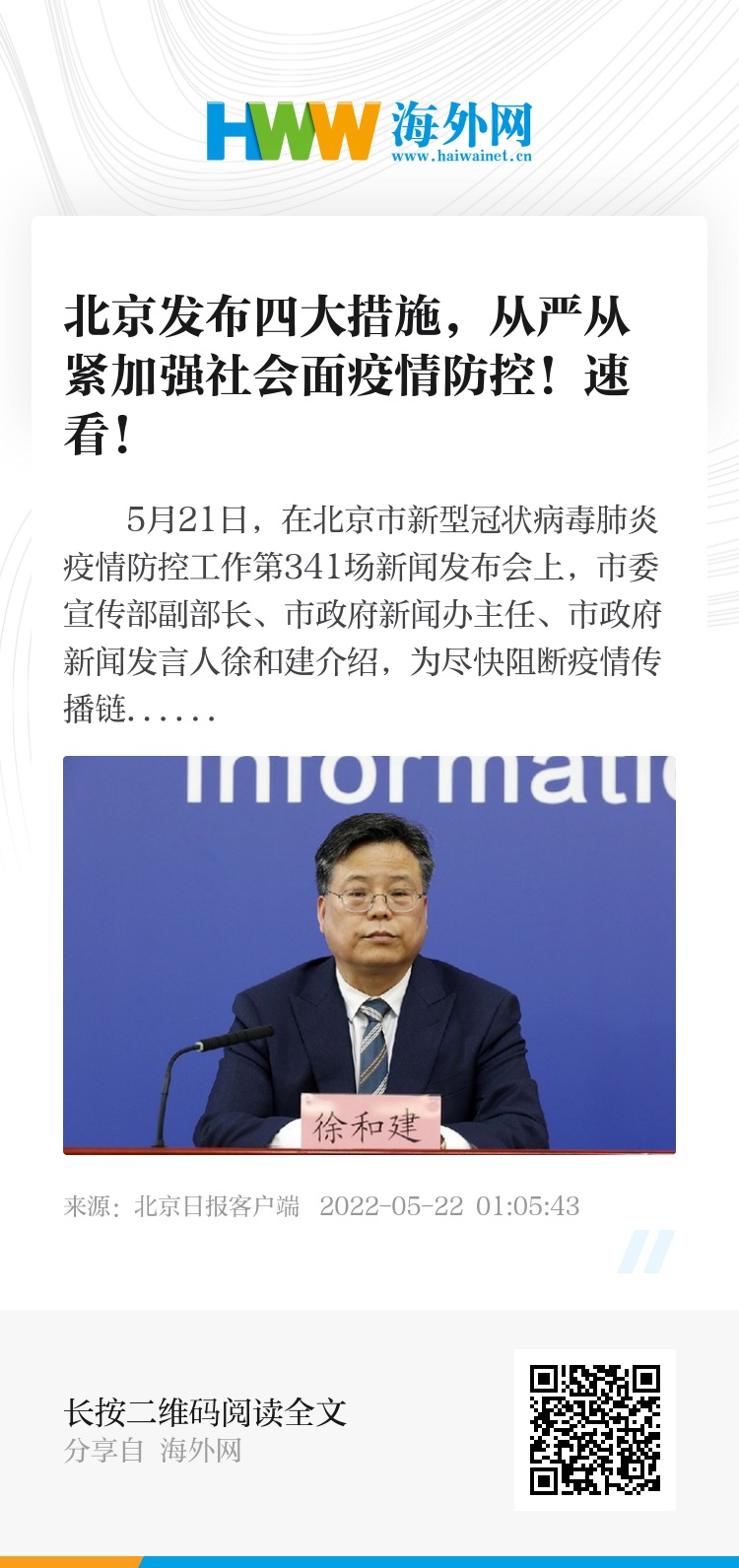 5月21日,在北京市新型冠状病毒肺炎疫情防控工作第341场新闻发布会上,市委宣传部副部长、市政府新闻办主任、市政府新闻发言人徐和建介绍,为尽快阻断疫情传播链条,争取用最短时间实现社会面清零目标,北京疫情防控工作领导小组、首都严格进京管理联防联控协调机制从当前防控需要出发,决定进一步从严从紧加强社会面疫情防控工作。
