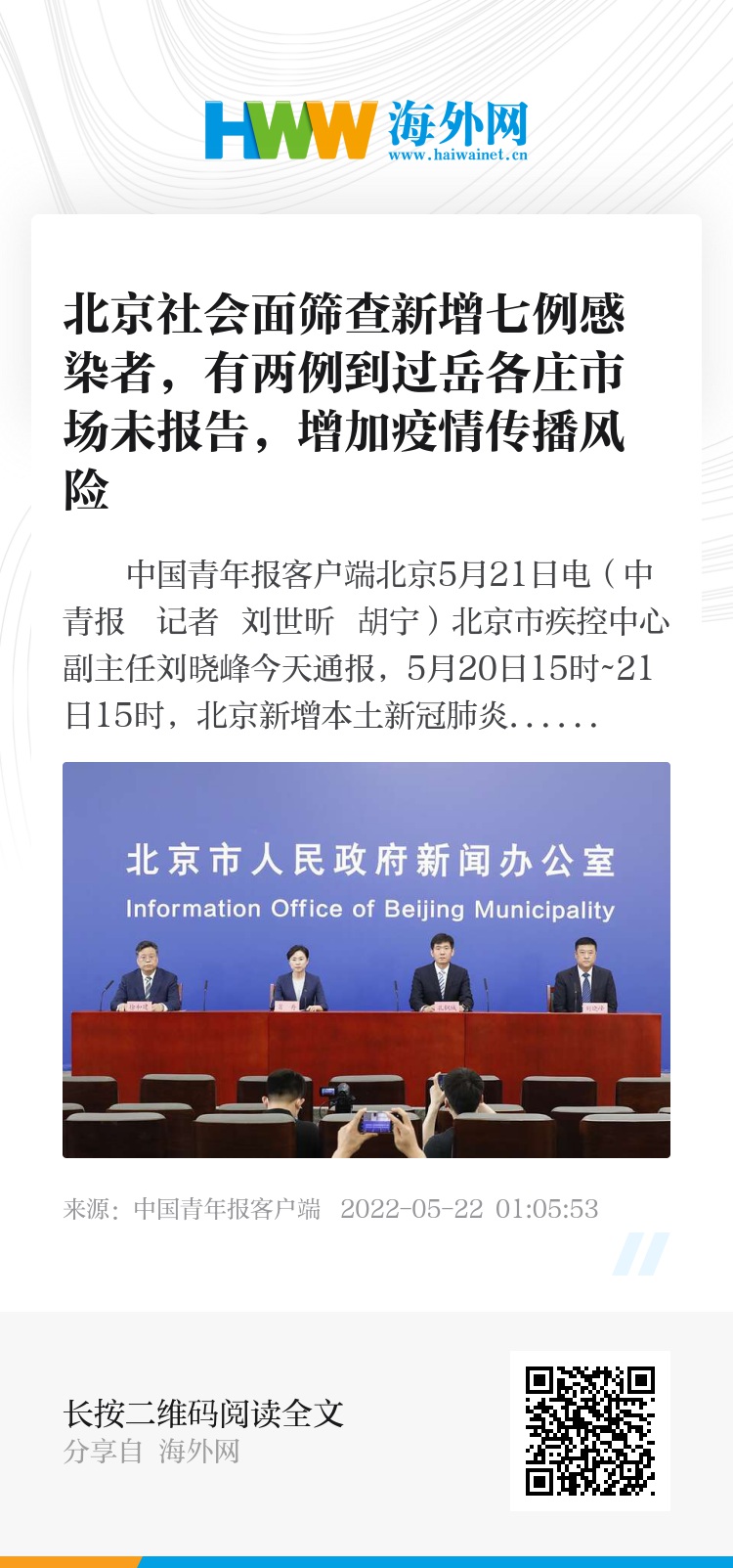 刘晓峰特别指出,今日通报的感染者有两例曾于5月4日至13日到访过岳各庄批发市场,在北京公布岳各庄批发市场聚集性疫情后,两人未及时主动向社区报备、未落实居家隔离,且活动轨迹涉及酒店、新发地批发市场、果蔬超市、美发店及部分小区,不仅危害自身健康,也对传染源追溯、密接范围确定等疫情防控工作造成了干扰,增加了疫情传播风险。