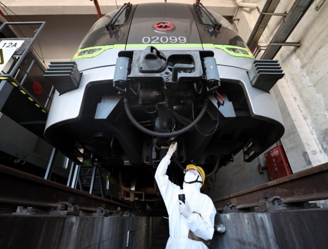 5月5日,车辆检修专业技术人员在上海地铁龙阳路基地对地铁车辆进行维护保养。新华社记者 陈建力 摄