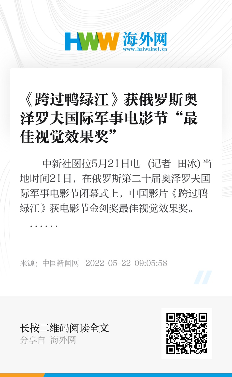 中新社图拉5月21日电 (记者 田冰)当地时间21日,在俄罗斯第二十届奥泽罗夫国际军事电影节闭幕式上,中国影片《跨过鸭绿江》获电影节金剑奖最佳视觉效果奖。