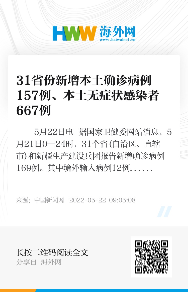 中新网5月22日电 据国家卫健委网站消息,5月21日0—24时,31个省(自治区、直辖市)和新疆生产建设兵团报告新增确诊病例169例。其中境外输入病例12例(福建7例,广西2例,云南2例,上海1例);本土病例157例(北京52例,上海52例,天津36例,四川12例,河南3例,广东1例,陕西1例),含45例由无症状感染者转为确诊病例(上海29例,天津12例,四川3例,北京1例)。新增死亡病例3例,均为本土病例,在上海;无新增疑似病例。
