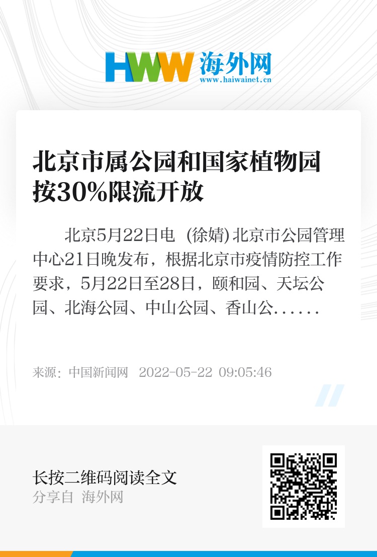 据了解,21日的北京疫情防控工作新闻的发布会上宣布,北京进一步从严从紧加强社会面疫情防控工作。为降低人员流动性,全市等级景区景点暂停开放,各类公园按照30%限流开放。