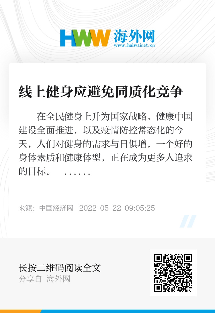 前不久发布的《关于构建更高水平的全民健身公共服务体系的意见》提出,到2035年,经常参加体育锻炼人数比例达到45%以上,体育健身和运动休闲成为普遍生活方式。从这个目标来看,无论线上线下,我们都需要更多的健身达人,能够带动大家一起甩起手迈开腿,在全社会范围内营造热爱体育、参与运动的良好氛围,在健康生活的同时,也推动线上健身行业健康发展。(常 理 来源:经济日报)