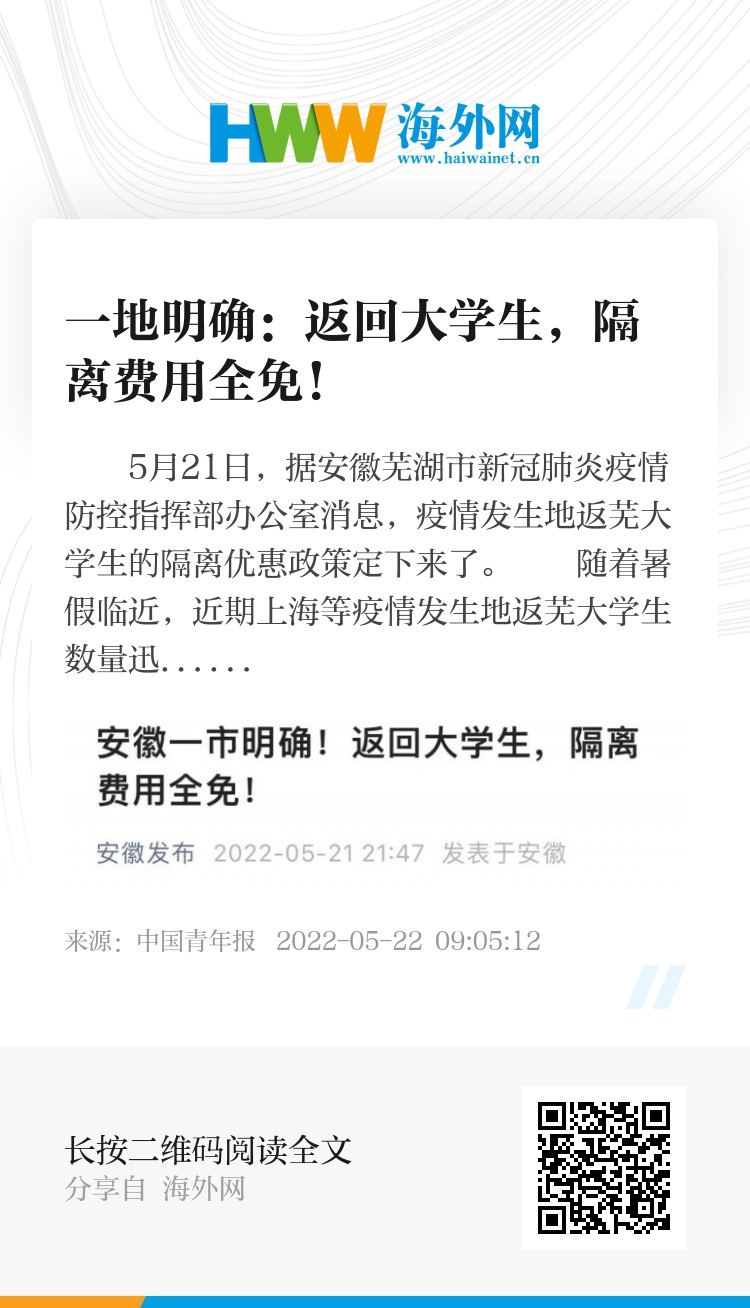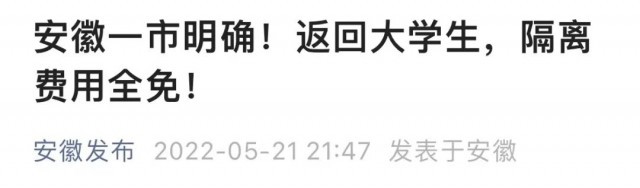 5月21日,据安徽芜湖市新冠肺炎疫情防控指挥部办公室消息,疫情发生地返芜大学生的隔离优惠政策定下来了。