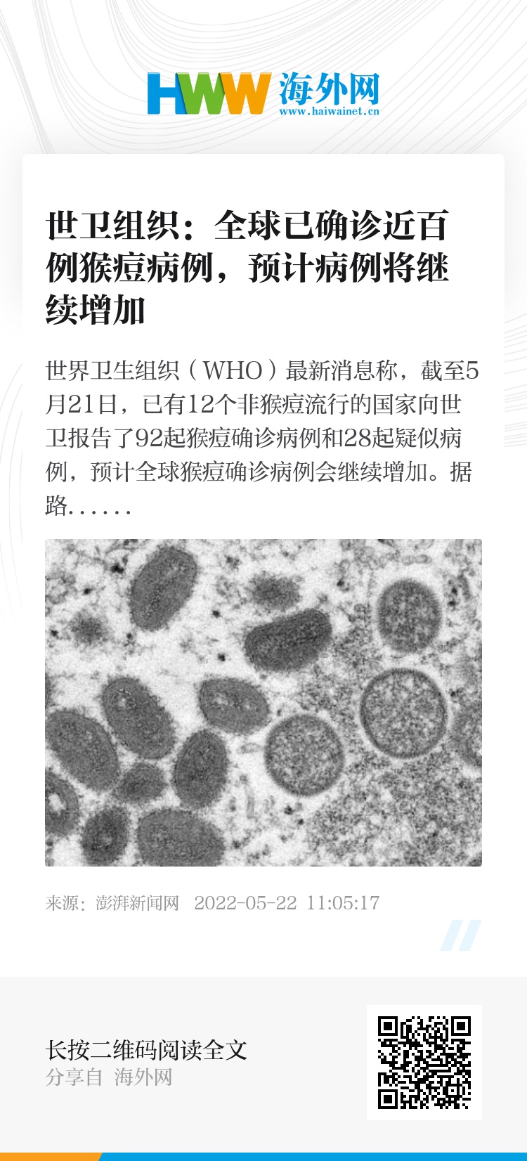世界卫生组织(WHO)最新消息称,截至5月21日,已有12个非猴痘流行的国家向世卫报告了92起猴痘确诊病例和28起疑似病例,预计全球猴痘确诊病例会继续增加。