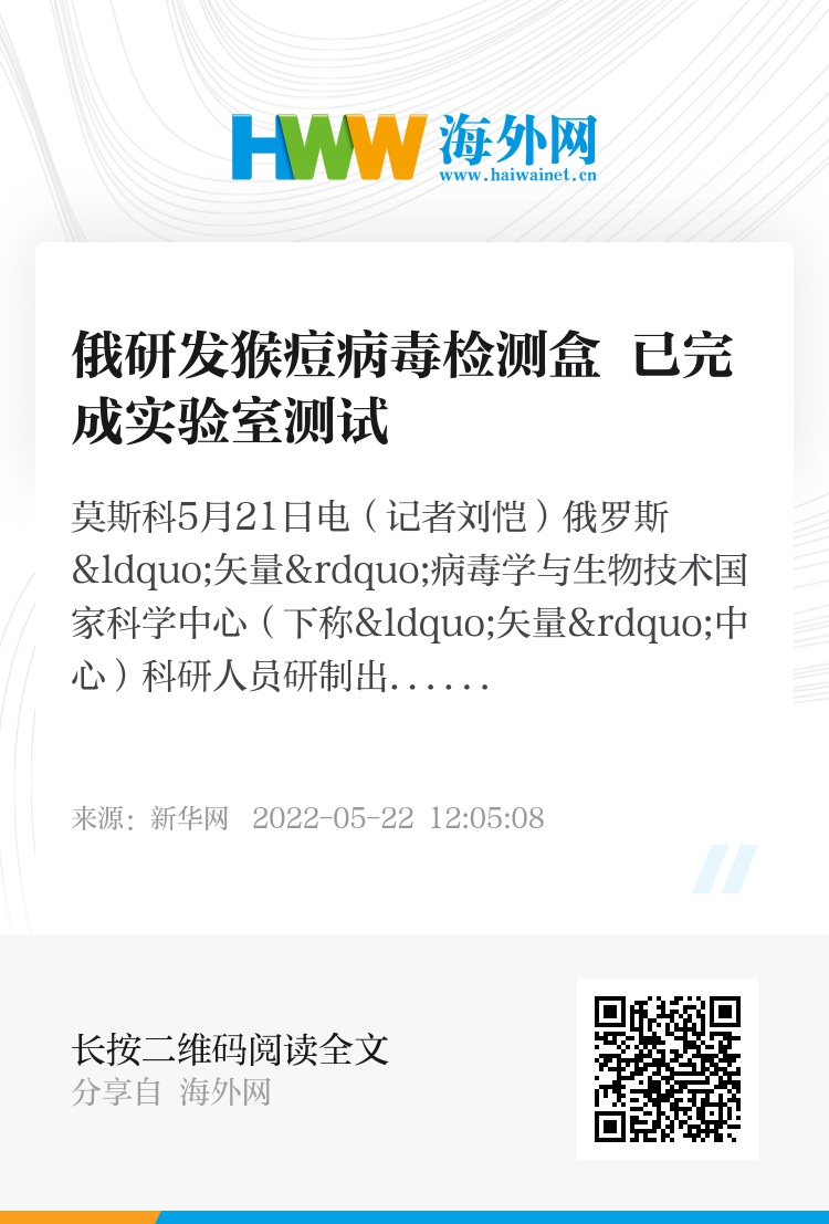新华社莫斯科5月21日电(记者刘恺)俄罗斯“矢量”病毒学与生物技术国家科学中心(下称“矢量”中心)科研人员研制出了一种自动操作的检测试剂盒(下称检测盒),可用于检测包括猴痘病毒在内的正痘病毒。针对该检测盒的实验室测试已顺利完成。