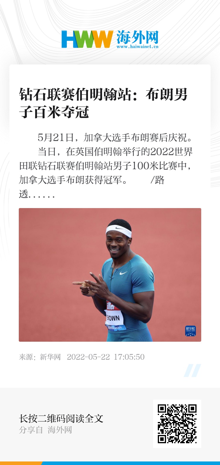 当日,在英国伯明翰举行的2022世界田联钻石联赛伯明翰站男子100米比赛中,加拿大选手布朗获得冠军。