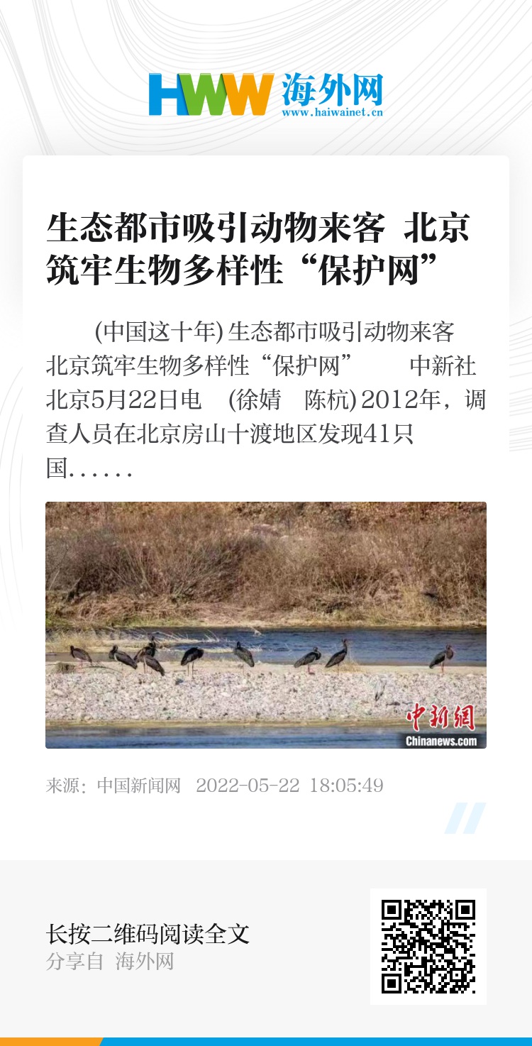 中新社北京5月22日电 (徐婧 陈杭)2012年,调查人员在北京房山十渡地区发现41只国家一级保护动物——黑鹳和11个黑鹳巢穴;十年间,原本以房山为迁徙中转站的黑鹳在此安家,种群数量增长到100余只,并飞出房山在北京其他区域定居。