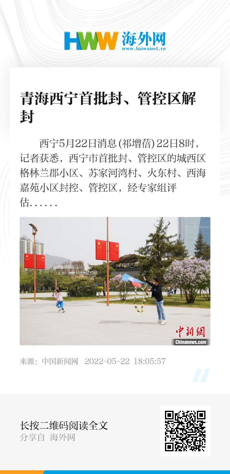 中新网西宁5月22日消息(祁增蓓)22日8时,记者获悉,西宁市首批封、管控区的城西区格林兰郡小区、苏家河湾村、火东村、西海嘉苑小区封控、管控区,经专家组评估,报请市新冠肺炎疫情防控处置工作指挥部同意,达到解封标准,于2022年5月22日零时起解除封管控。