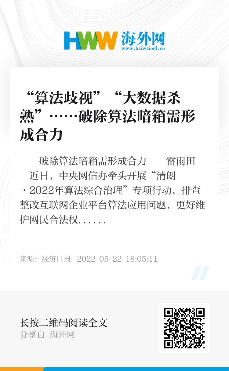 近日,中央网信办牵头开展“清朗·2022年算法综合治理”专项行动,排查整改互联网企业平台算法应用问题,更好维护网民合法权益,营造风清气正的网络空间。