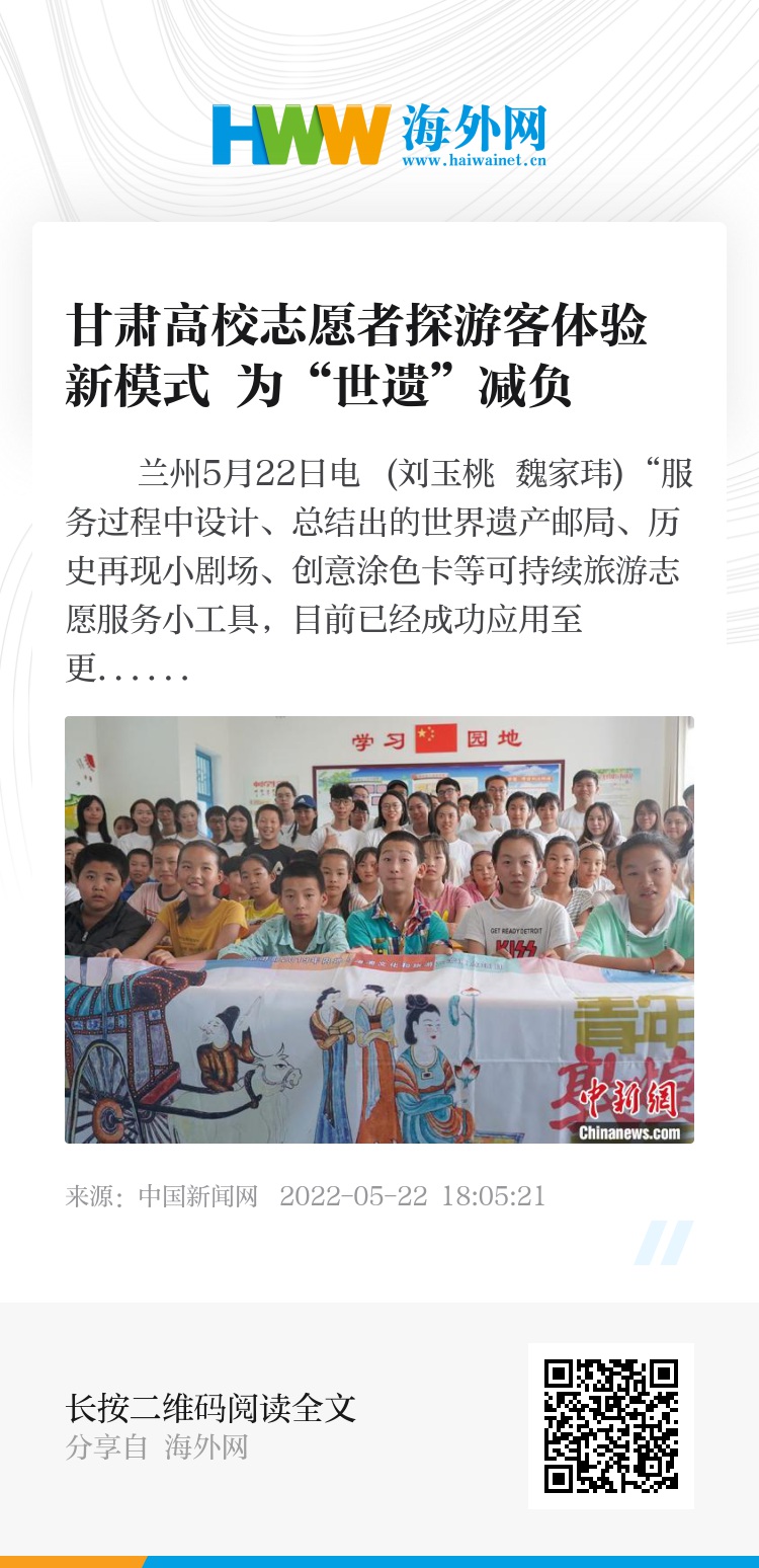 中新网兰州5月22日电 (刘玉桃 魏家玮)“服务过程中设计、总结出的世界遗产邮局、历史再现小剧场、创意涂色卡等可持续旅游志愿服务小工具,目前已经成功应用至更多景区,为景区减压同时推广世界遗产可持续旅游志愿服务理念。”兰州大学研究生陈静说。