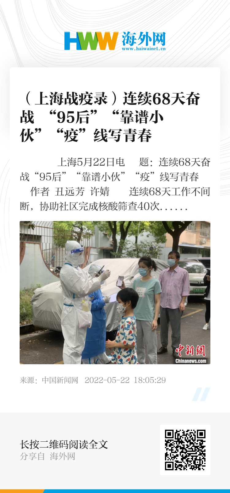 中新网上海5月22日电 题:连续68天奋战“95后”“靠谱小伙”“疫”线写青春