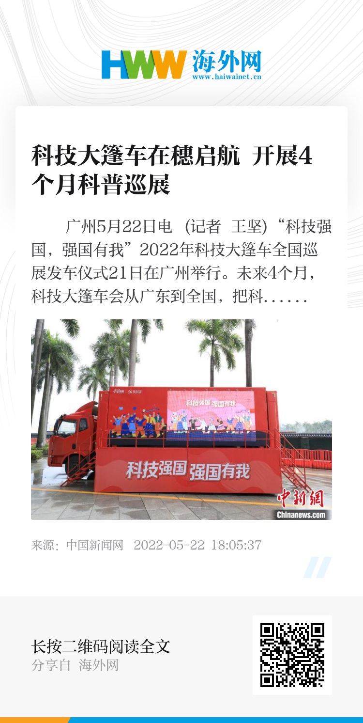 中新网广州5月22日电 (记者 王坚)“科技强国,强国有我”2022年科技大篷车全国巡展发车仪式21日在广州举行。未来4个月,科技大篷车会从广东到全国,把科普展项带到全国十余个省、自治区的青少年身边。