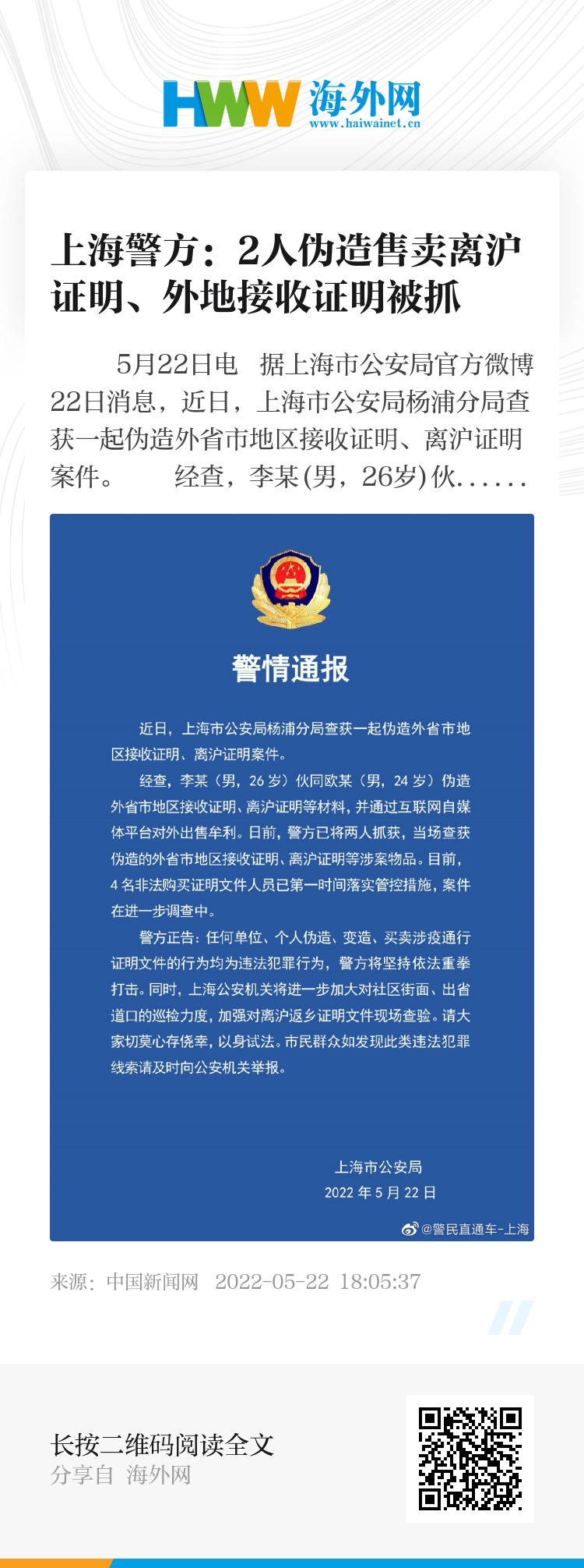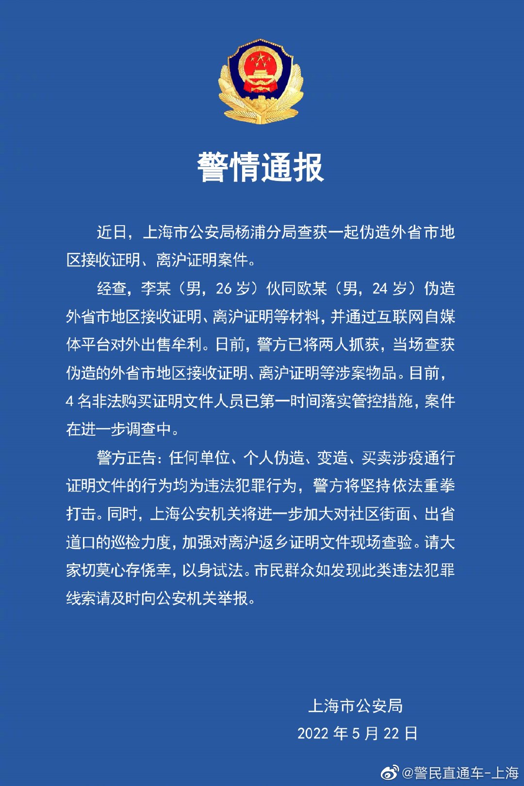 经查,李某(男,26岁)伙同欧某(男,24岁)伪造外省市地区接收证明、离沪证明等材料,并通过互联网自媒体平台对外出售牟利。日前,警方已将两人抓获,当场查获伪造的外省市地区接收证明、离沪证明等涉案物品。目前,4名非法购买证明文件人员已第一时间落实管控措施,案件在进一步调查中。
