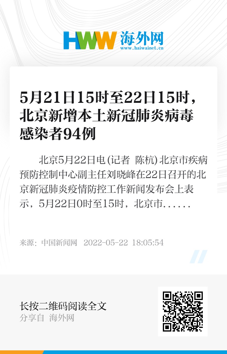中新网北京5月22日电(记者 陈杭)北京市疾病预防控制中心副主任刘晓峰在22日召开的北京新冠肺炎疫情防控工作新闻发布会上表示,5月22日0时至15时,北京市新增本土新冠肺炎病毒感染者67例。自5月21日发布会后(5月21日15时至22日15时),新增本土新冠肺炎病毒感染者94例(感染者1538至1631),丰台区41例,海淀区24例,房山区14例,东城区7例,昌平区3例,西城区、朝阳区各2例,大兴区1例;重型1例,普通型14例,轻型66例,无症状感染者13例;管控人员77例,社会面筛查17例。均已转至定点医院隔离治疗,相关风险点位及人员已管控落位。