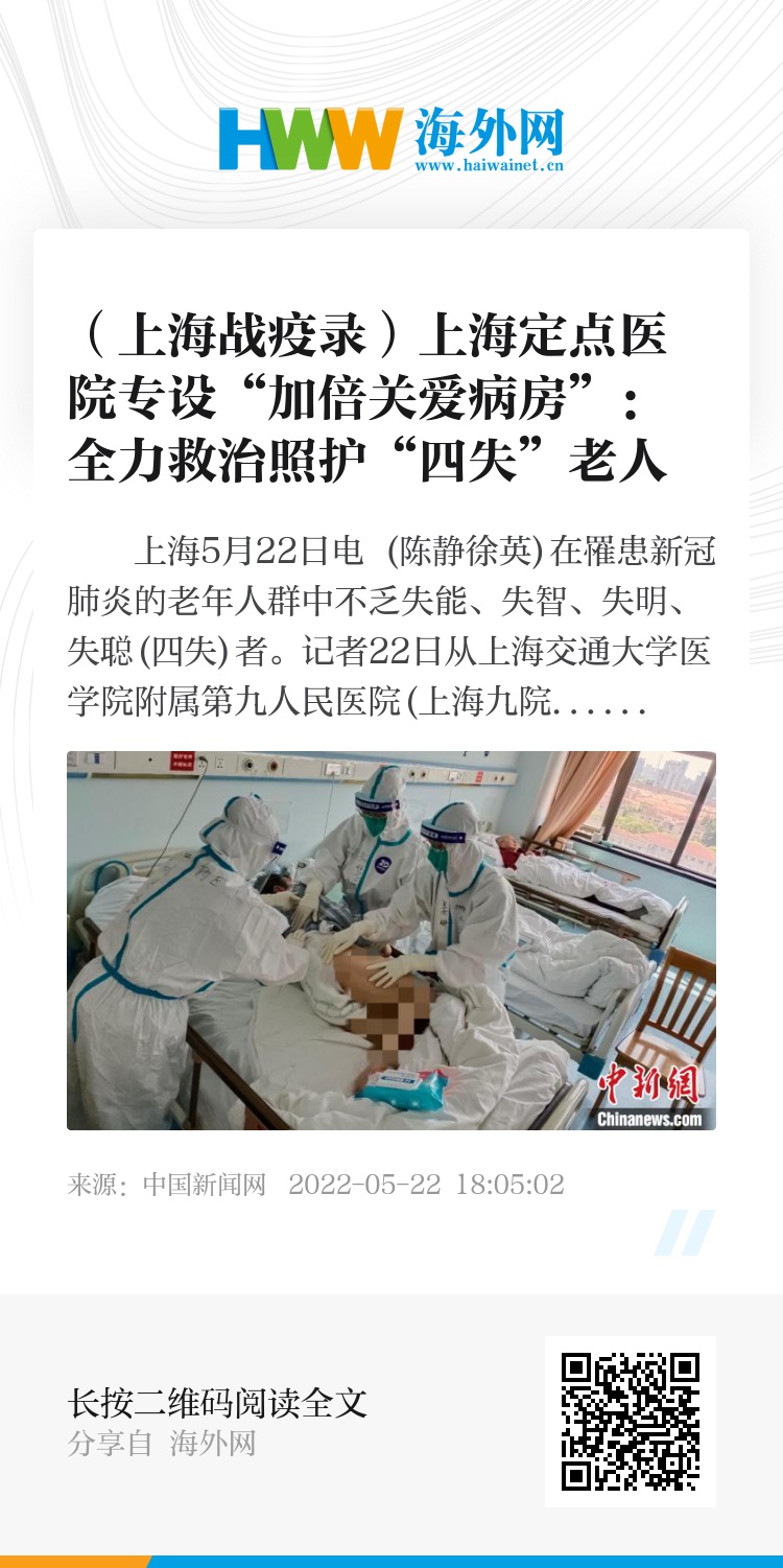 中新网上海5月22日电 (陈静徐英)在罹患新冠肺炎的老年人群中不乏失能、失智、失明、失聪(四失)者。记者22日从上海交通大学医学院附属第九人民医院(上海九院)获悉,该院北部新冠救治定点医院特别在12病区专设“加倍关爱病房”。迄今为止,已有20多位“四失”老人在“加倍关爱病房”接受医治,相继出院19位。