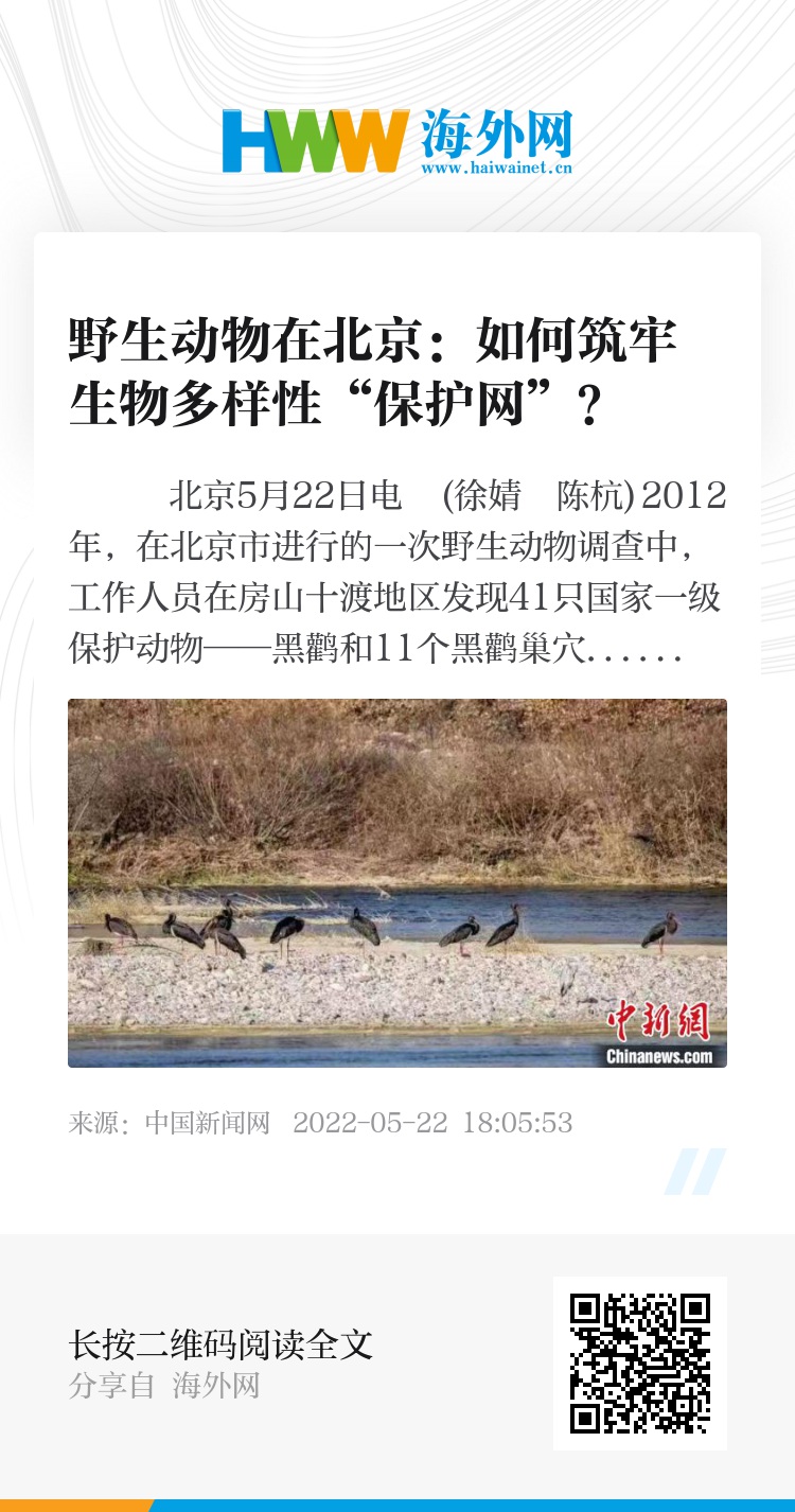 中新网北京5月22日电 (徐婧 陈杭)2012年,在北京市进行的一次野生动物调查中,工作人员在房山十渡地区发现41只国家一级保护动物——黑鹳和11个黑鹳巢穴。