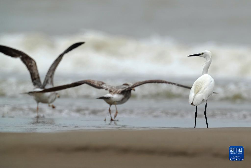 在闽江河口湿地,黑尾鸥和白鹭在海滩上觅食嬉戏(5月21日摄)。