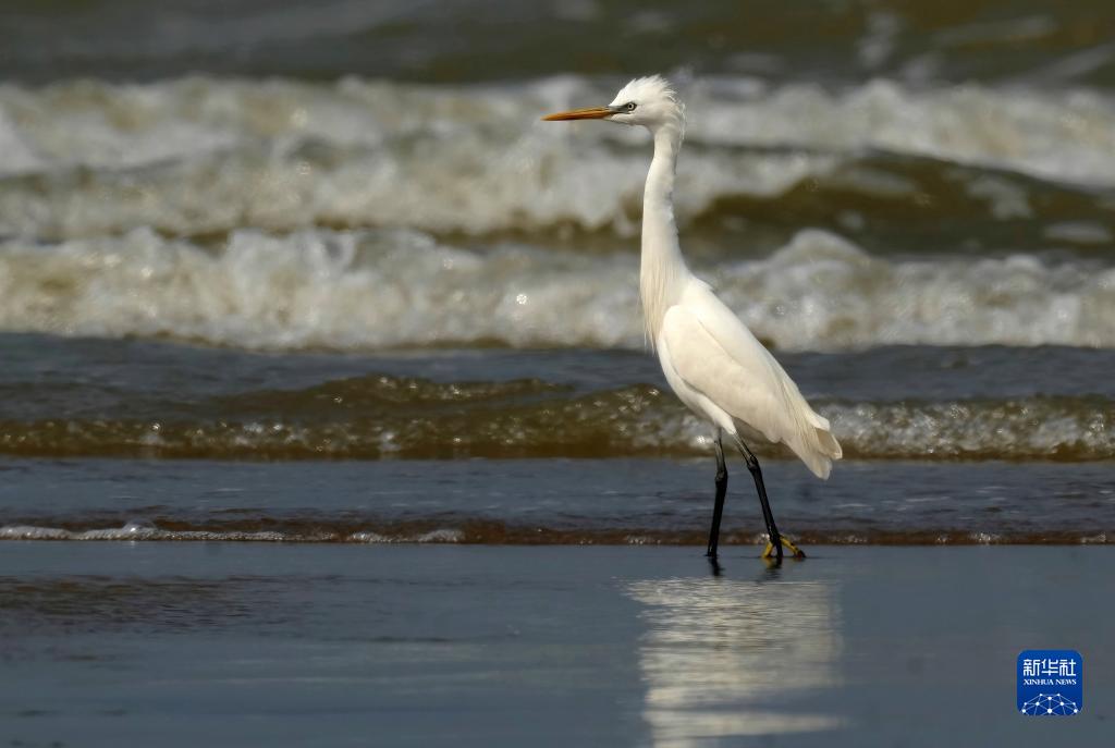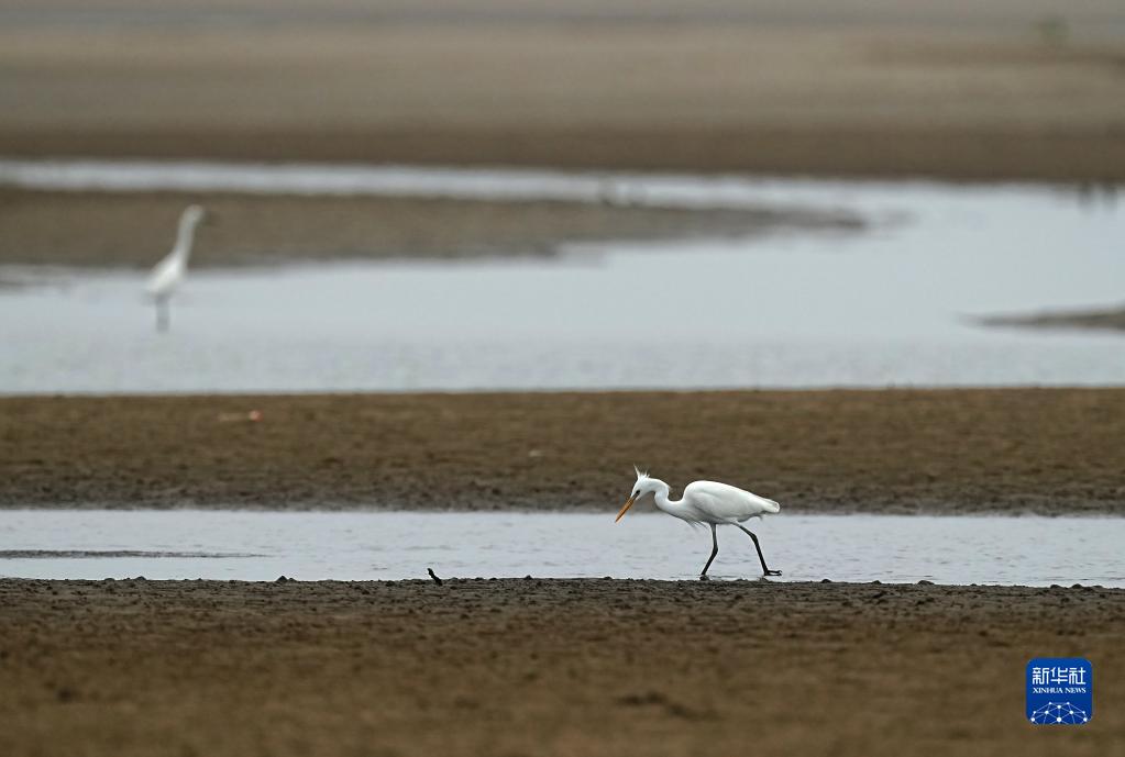 在闽江河口湿地,黄嘴白鹭在海滩上觅食(5月21日摄)。