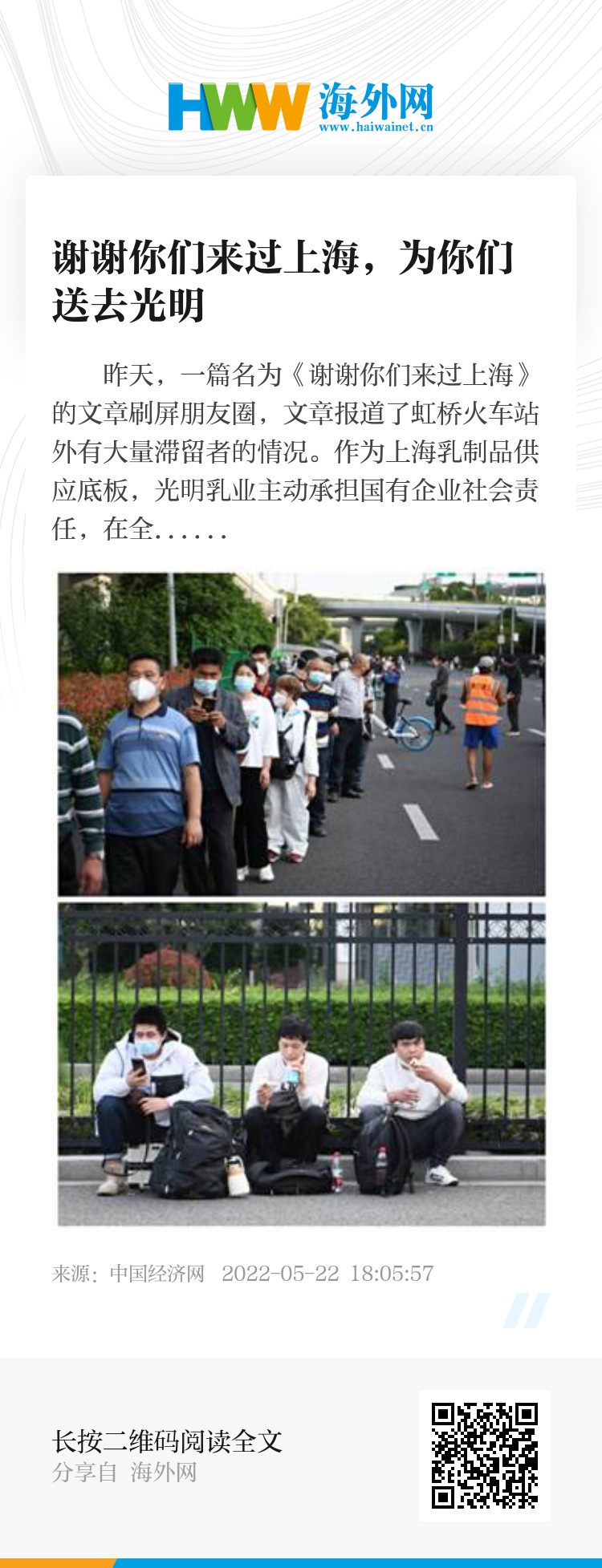 当我们得知这条新闻时,我们非常关注。他们曾是上海这个城市的建设者。疫情当前,作为与上海这座城市同频共振的百年企业,光明乳业希望能帮助他们,让他们知道上海这座城市,绝不冰冷,一定有希望和光明。光明乳业相关负责人告诉记者,为了让滞留者补充营养,光明乳业第一时间安排旗下牛奶棚食品、常温营销中心联动,准备了光明纯牛奶,莫斯利安酸奶和牛奶棚点心,由旗下领鲜物流安排两辆专车。在下午4点左右,满载着爱心物资的车辆到达虹桥火车站,现场滞留人群有序排队,领取了光明乳业免费发放的食物。一杯牛奶,一个蛋糕,不仅传递国有企业的责任与担当,也表达了对滞留人群的关爱和尊重。