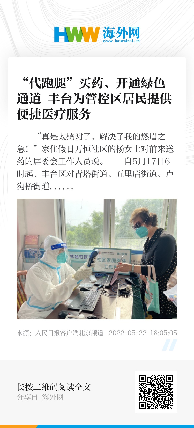 自5月17日6时起,丰台区对青塔街道、五里店街道、卢沟桥街道部分区域采取临时管控措施。杨女士因无法正常就诊开日常高血压药,非常着急。居委会工作人员随即联系假日万恒社区卫生服务站,家庭医生张翼霖立即响应,与杨女士视频联系,了解患者病情及用药需求,利用电子医保卡,替杨女士完成取药后,由社区卫生服务站站长李京京将药品转交居委会工作人员,送到杨女士手中。
