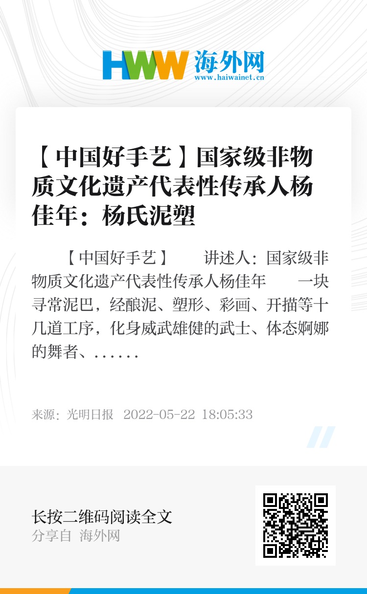 在我手里,杨氏泥塑手艺走进校园、研学基地,由传家变成传世。我还注册公司,把杨氏泥塑工艺品推向市场,每年创收上百万元,让乡亲们既传承手艺又有收入。