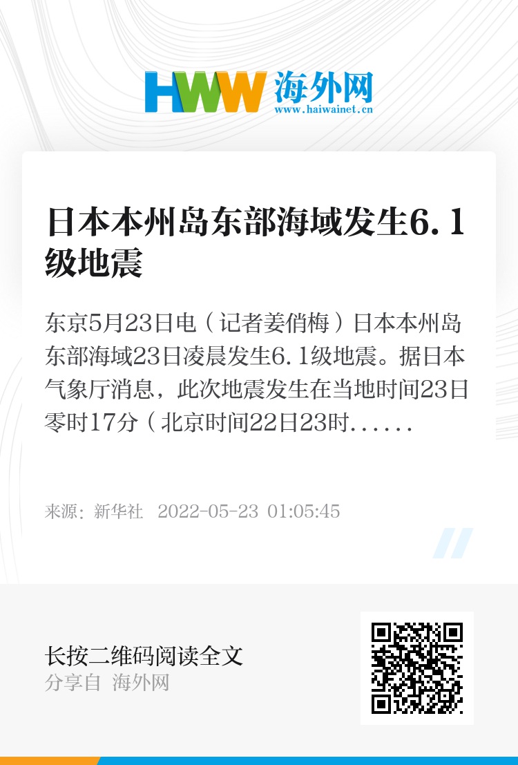 新华社东京5月23日电(记者姜俏梅)日本本州岛东部海域23日凌晨发生6.1级地震。