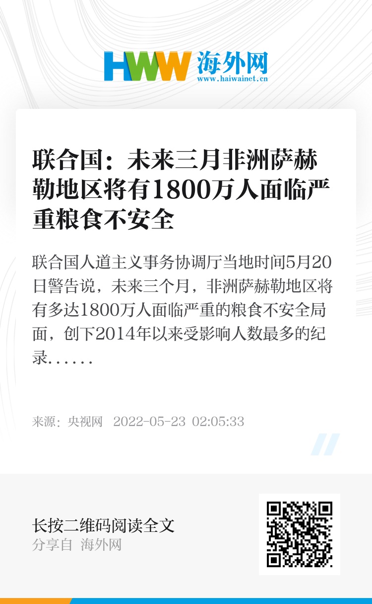 联合国人道主义事务协调厅当地时间5月20日警告说,未来三个月,非洲萨赫勒地区将有多达1800万人面临严重的粮食不安全局面,创下2014年以来受影响人数最多的纪录。