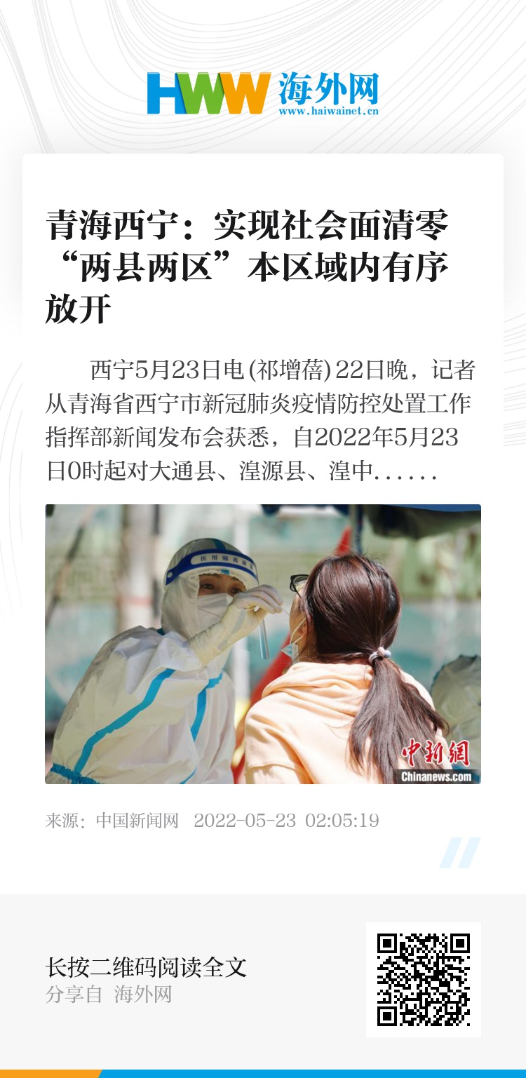 此外,西宁市卫健委副主任应海涛介绍,为加大重点人群潜在风险摸排力度,全面查清阻断传播链条,消除疫情传播风险。5月18日以来,西宁市按照分级分类、突出重点、快速有效、保质保量的原则,对主城区、大通县、湟源县、湟中区(含多巴新城)及各县区封控区、管控区、防范区重点区域人群,医疗卫生、交通、养老、物流快递、市场等重点行业人群开展了核酸检测。截至目前,共完成核酸检测399.42万人份;社会面人群核酸检测筛查中,结果均为阴性;重点集中管控人群核酸检测筛查中,结果均为阴性。
