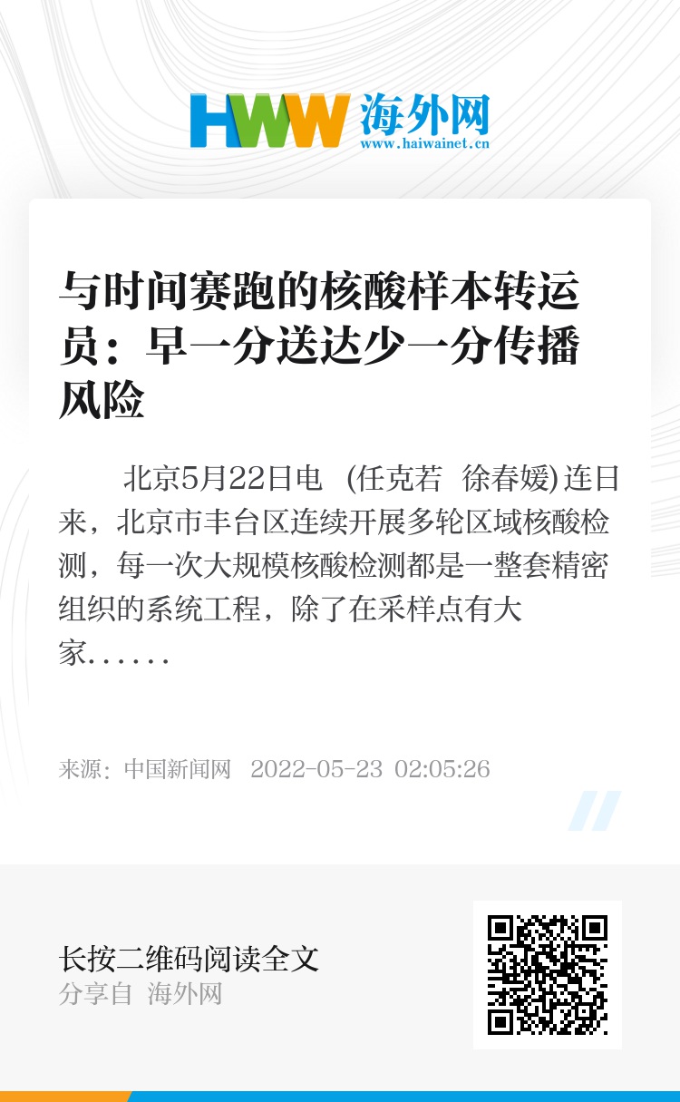 中新网北京5月22日电 (任克若 徐春媛)连日来,北京市丰台区连续开展多轮区域核酸检测,每一次大规模核酸检测都是一整套精密组织的系统工程,除了在采样点有大家所熟知的采样、信息登记、秩序维护等岗位,还有很多默默为疫情防控贡献力量的其他岗位。其中有一种岗位,连接了一线采样点和后方实验室,那就是核酸样本转运员,用最快的速度将各个采样点采集的核酸样本及时汇总整理并转运至核酸检测实验室。