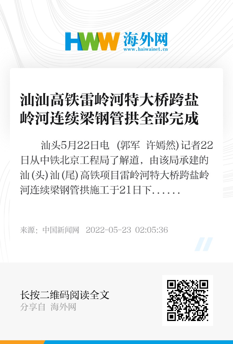 中新网汕头5月22日电 (郭军 许嫣然)记者22日从中铁北京工程局了解道,由该局承建的汕(头)汕(尾)高铁项目雷岭河特大桥跨盐岭河连续梁钢管拱施工于21日下午全部完成,为后续架梁及无砟轨道施工奠定了坚实的基础。
