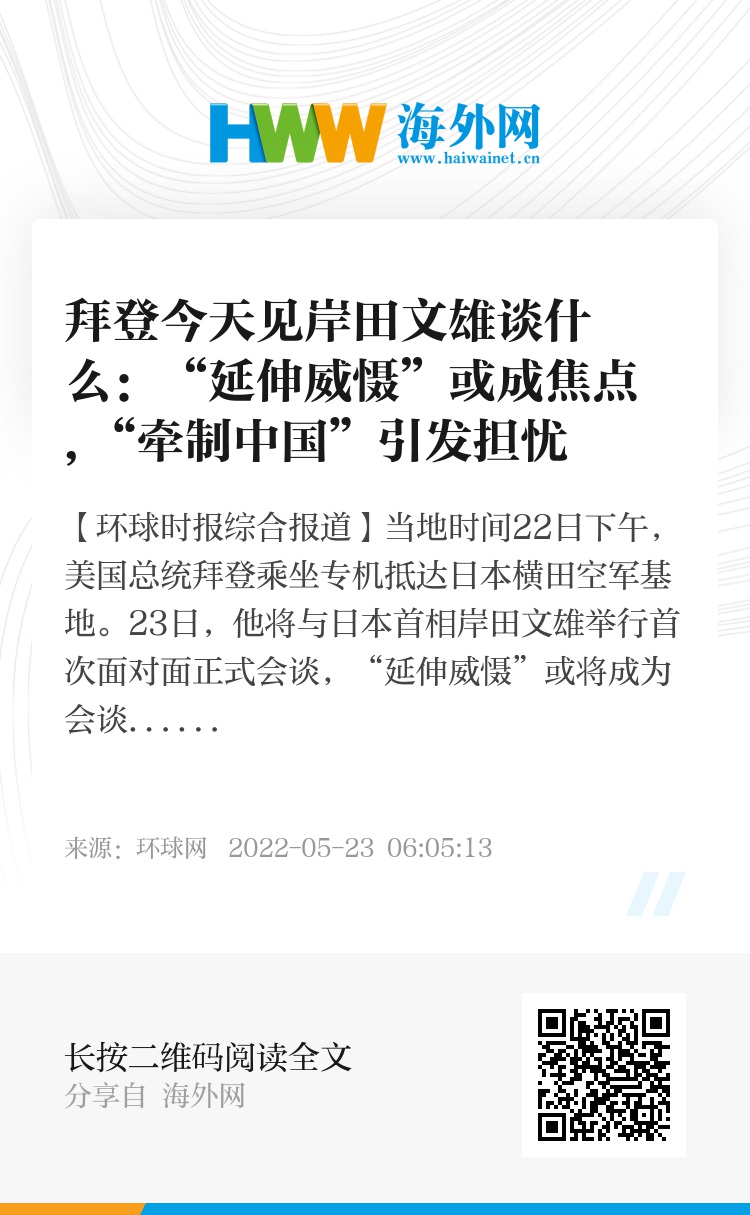 【环球时报综合报道】当地时间22日下午,美国总统拜登乘坐专机抵达日本横田空军基地。23日,他将与日本首相岸田文雄举行首次面对面正式会谈,“延伸威慑”或将成为会谈的关键词。日媒称,预计双方将围绕加强美国以核与常规战力参与日本防卫的“延伸威慑”进行协商,而这背后对抗中国、俄罗斯和朝鲜的意图不言而喻。今明两天,拜登还将发表有关“印太经济框架”(IPEF)的声明,并参加“四方安全对话”(QUAD)领导人会议。访问日本前,拜登先与韩国总统尹锡悦在首尔举行了会谈并发表联合声明。声明中并未直接提及中国,然而“印太”“供应链”等字眼相较于去年的两国领导人联合声明有所增加,加上IPEF是他们会谈的核心议题,在外媒看来,这一系列“信号”都指向了“遏制中国”。对于日韩政府紧跟美国的步伐,两国不少民众都很担忧。从首尔到东京,《环球时报》记者连日来在反对拜登到访的集会上不断听到他们的疾呼:美国的做法为地区局势动荡埋下祸根,韩日两国不该将自身置于危险境地。