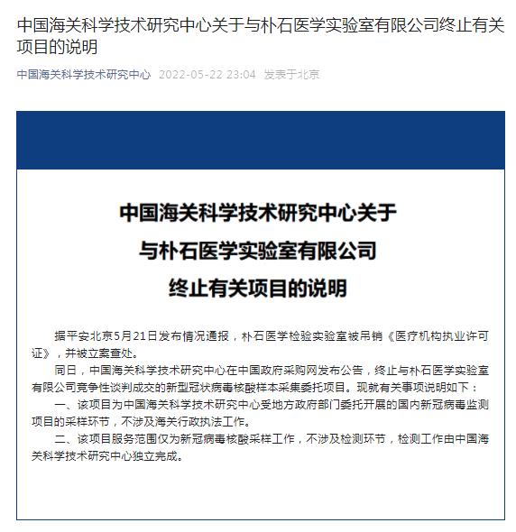 中新网5月23日电 中国海关科学技术研究中心22日在其微信公众号发布关于与朴石医学实验室有限公司终止有关项目的说明称,据平安北京5月21日发布情况通报,朴石医学检验实验室被吊销《医疗机构执业许可证》,并被立案查处。同日,中国海关科学技术研究中心在中国政府采购网发布公告,终止与朴石医学实验室有限公司竞争性谈判成交的新型冠状病毒核酸样本采集委托项目。