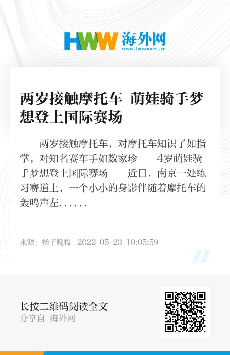 扬子晚报紫牛新闻记者了解到,男孩名叫夏伯恩,两岁开始接触摩托车,作为重度“发烧友”的爸爸带他开始了全国骑行,坐在摩托车后座上成长到现在天天“泡”在赛车场上,夏伯恩成为全国最小的“车迷”之一,不仅对摩托车知识了如指掌,对国际知名赛车手也是如数家珍,他的梦想是成为职业赛车手走上国际赛场。