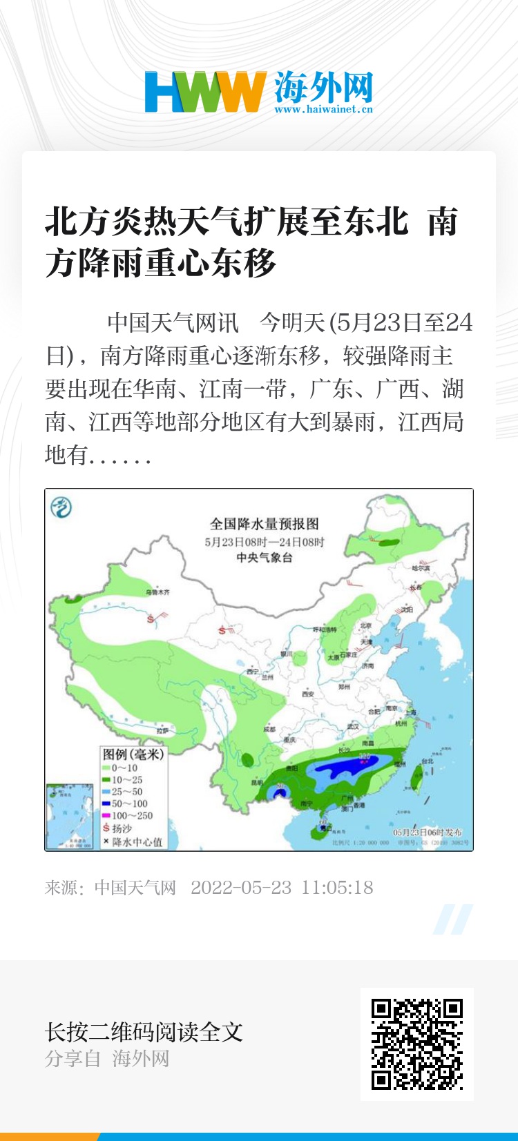 中国天气网讯 今明天(5月23日至24日),南方降雨重心逐渐东移,较强降雨主要出现在华南、江南一带,广东、广西、湖南、江西等地部分地区有大到暴雨,江西局地有大暴雨。气温方面,北方炎热天气今天将向东北扩展,长春、哈尔滨都将突破30℃。