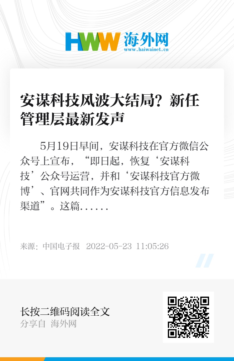 5月19日早间,安谋科技在官方微信公众号上宣布,“即日起,恢复‘安谋科技’公众号运营,并和‘安谋科技官方微博’、官网共同作为安谋科技官方信息发布渠道”。这篇声明还附有安谋科技联席首席执行官公开信,信中提到,“公司新任联席首席执行官刘仁辰博士和陈恂博士已全面接管安谋科技的商业经营”。这离4月23日该微信公众号发布上一条消息,已经过去了25天。
