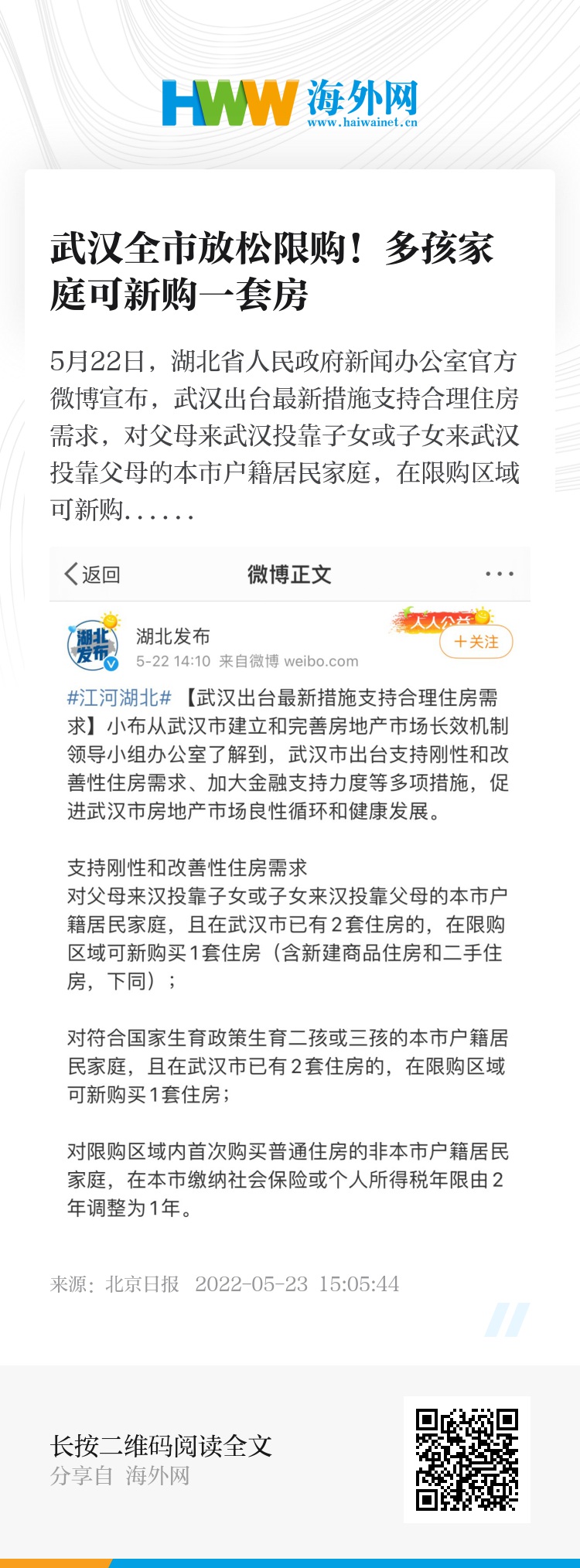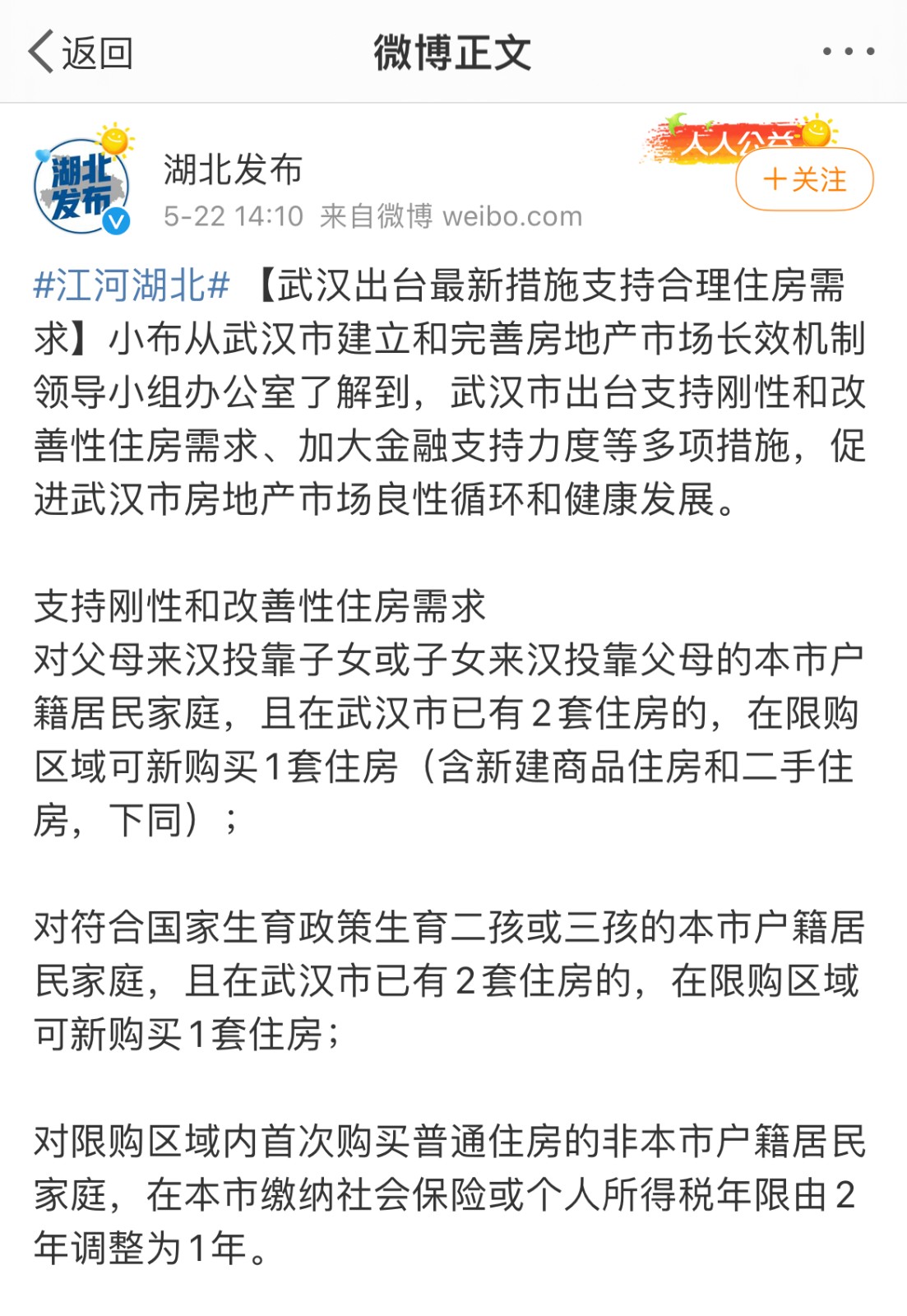 5月22日,湖北省人民政府新闻办公室官方微博宣布,武汉出台最新措施支持合理住房需求,对父母来武汉投靠子女或子女来武汉投靠父母的本市户籍居民家庭,在限购区域可新购一套住房,另外,生育二孩或三孩的武汉市户籍家庭在限购区域也可新购一套住房。