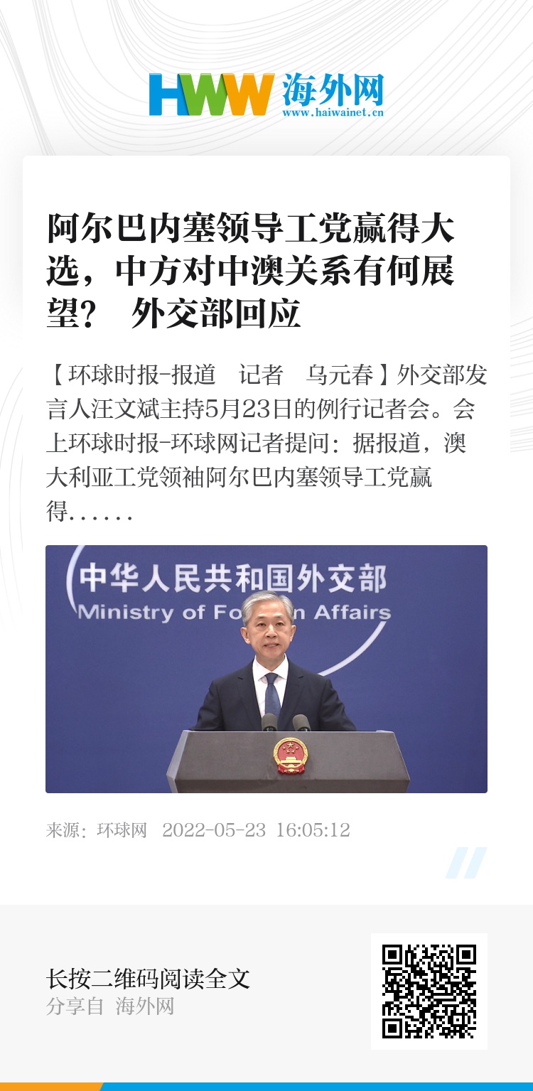 【环球时报-环球网报道 记者 乌元春】外交部发言人汪文斌主持5月23日的例行记者会。会上环球时报-环球网记者提问:据报道,澳大利亚工党领袖阿尔巴内塞领导工党赢得大选。请问中方对中澳关系有何展望?