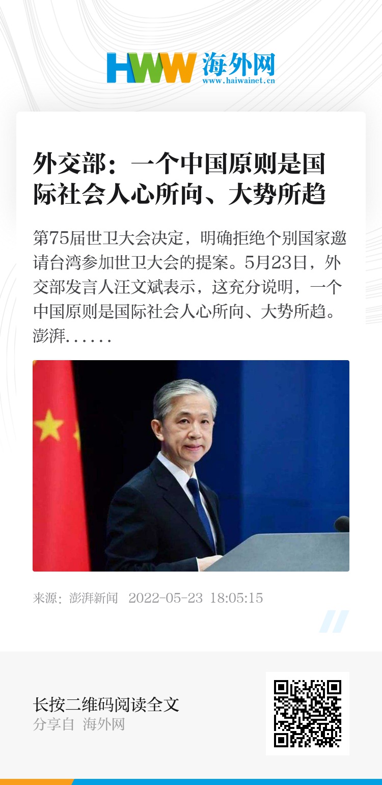 第75届世卫大会决定,明确拒绝个别国家邀请台湾参加世卫大会的提案。5月23日,外交部发言人汪文斌表示,这充分说明,一个中国原则是国际社会人心所向、大势所趋。