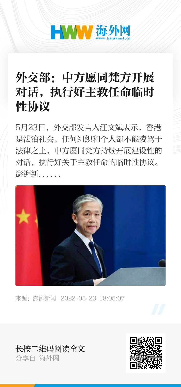 5月23日,外交部发言人汪文斌表示,香港是法治社会,任何组织和个人都不能凌驾于法律之上,中方愿同梵方持续开展建设性的对话,执行好关于主教任命的临时性协议。
