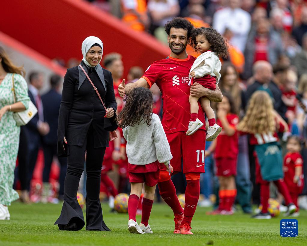 5月22日,利物浦队球员萨拉赫(右二)与家人在比赛后。新华社发
