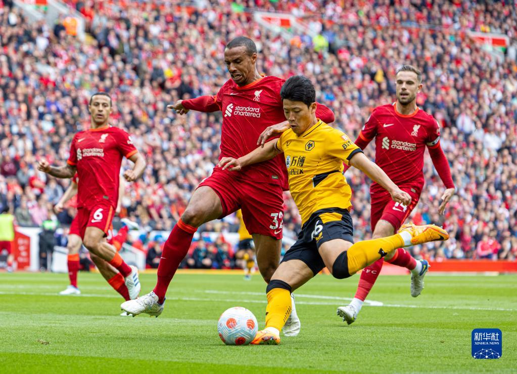 5月22日,利物浦队球员马蒂普(前左)与狼队球员黄喜灿拼抢。新华社发