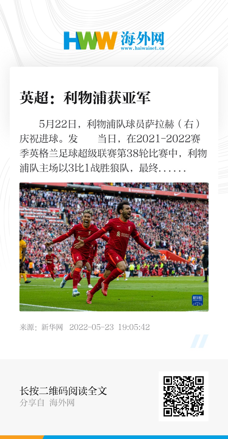 当日,在2021-2022赛季英格兰足球超级联赛第38轮比赛中,利物浦队主场以3比1战胜狼队,最终以1分劣势排在曼彻斯特城队之后,获得本赛季英超联赛亚军。
