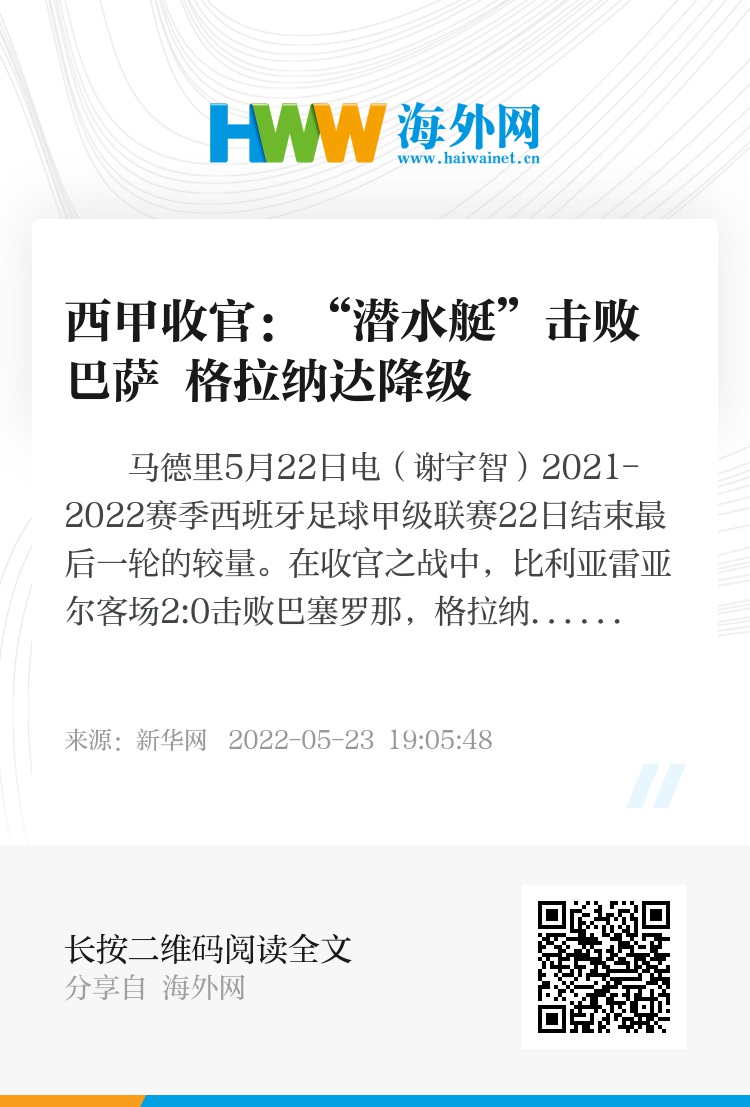 新华社马德里5月22日电(谢宇智)2021-2022赛季西班牙足球甲级联赛22日结束最后一轮的较量。在收官之战中,比利亚雷亚尔客场2:0击败巴塞罗那,格拉纳达在主场0:0战平西班牙人后成为本赛季最后一支降级球队。